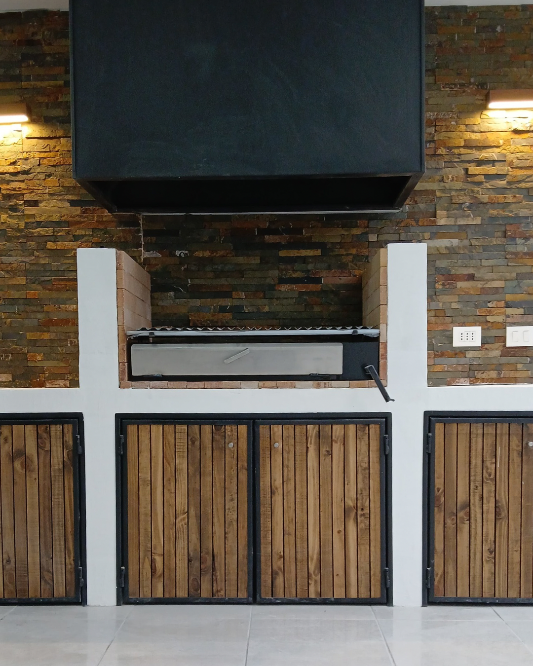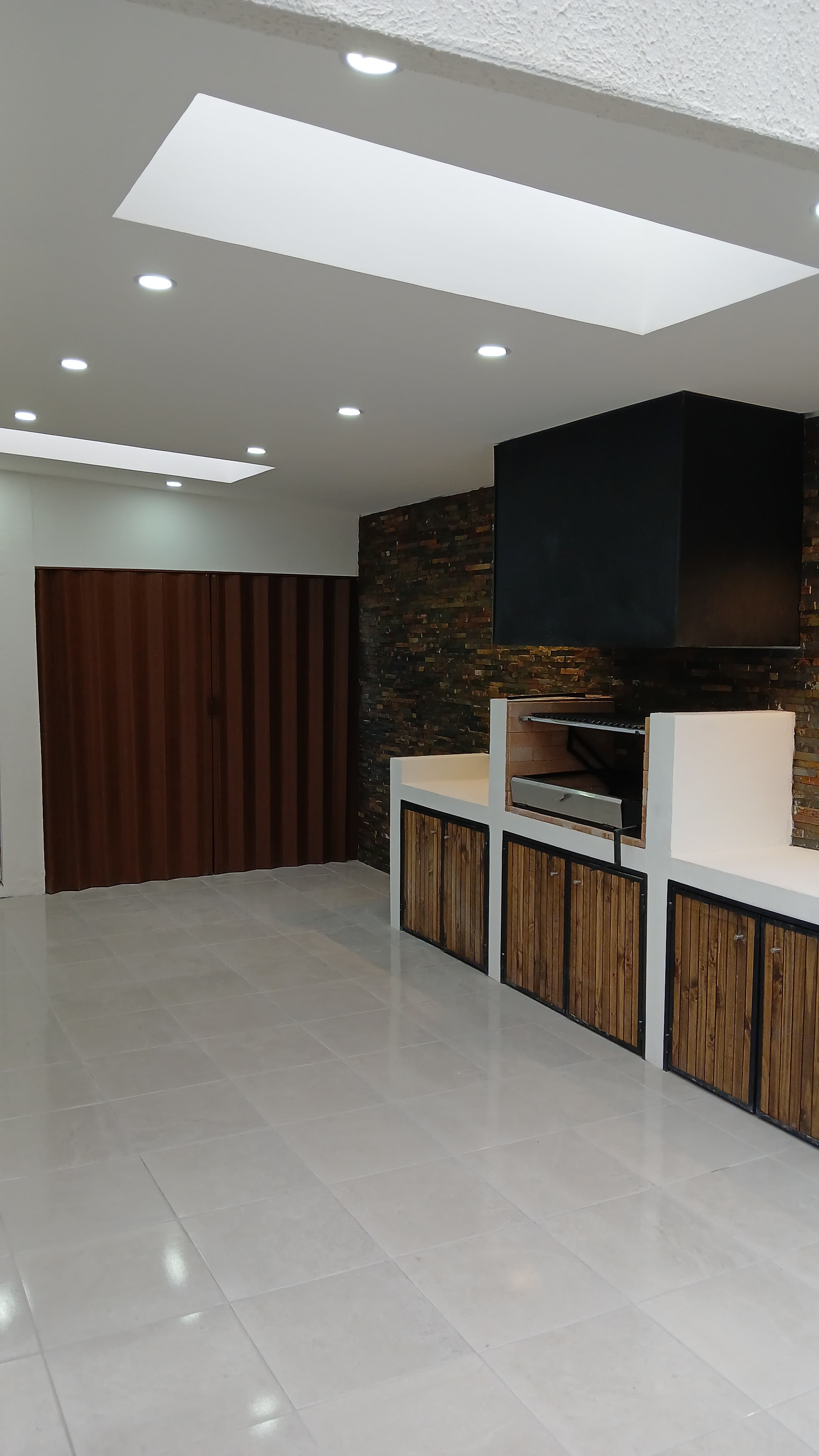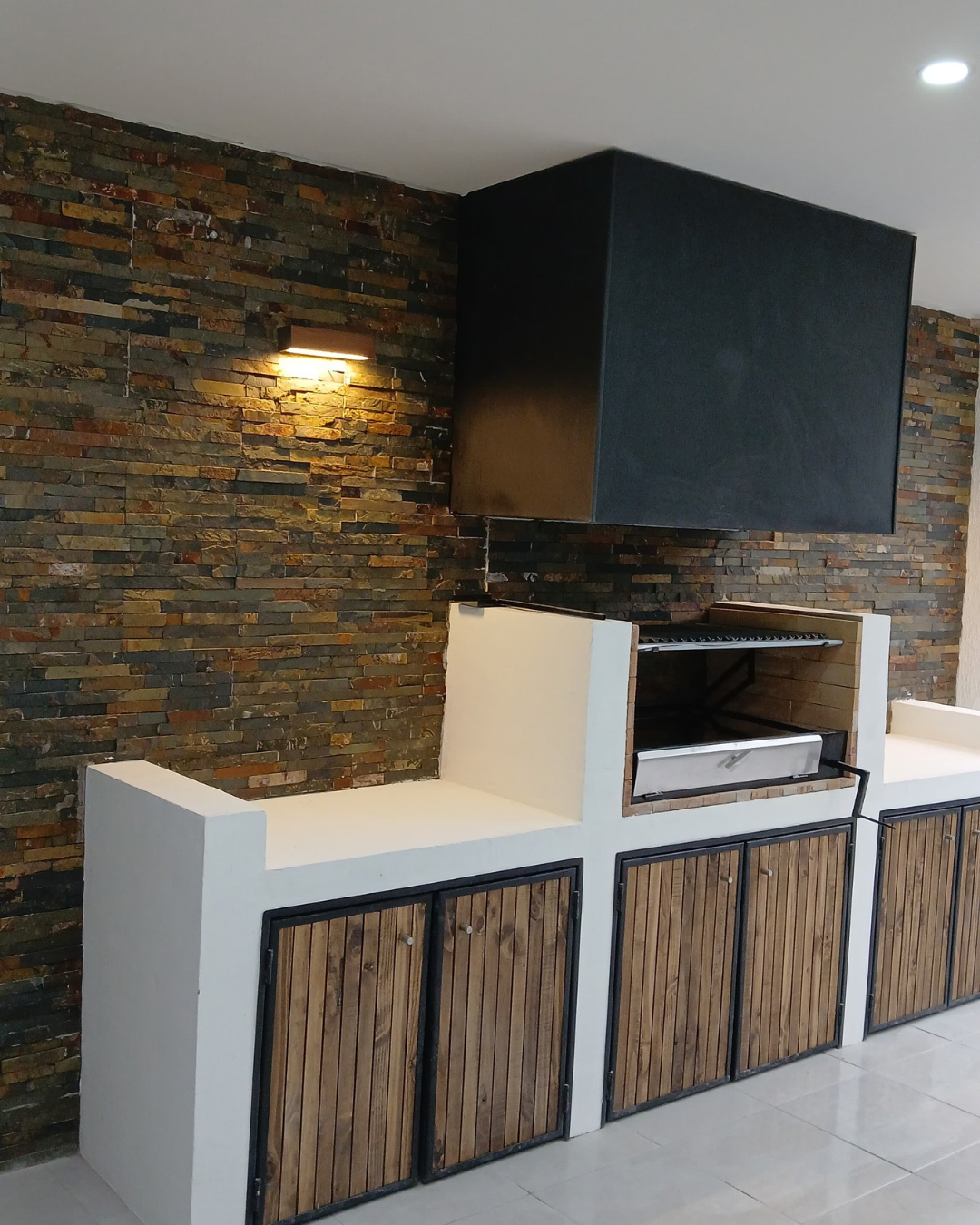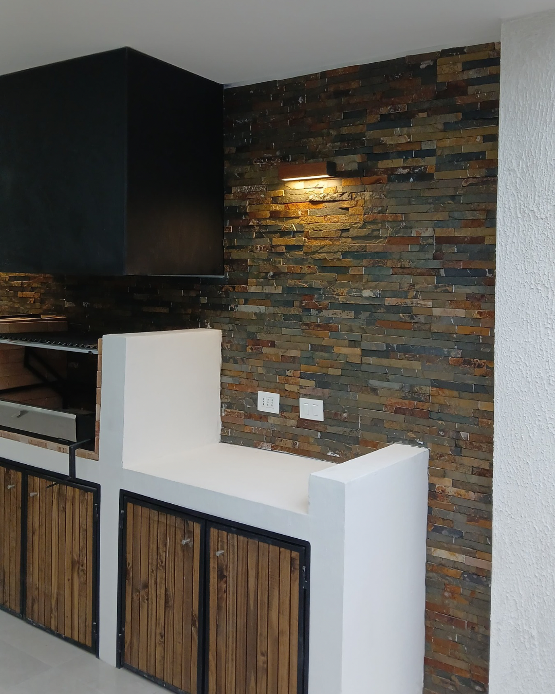 Construccion de terraza mediterranea con lucarnas para iluminacion natural. Se considera un quincho fabricado en obra con parrilla para carbon y campana extractora tipo mediterranea con muro revestido en piedra pizarra.